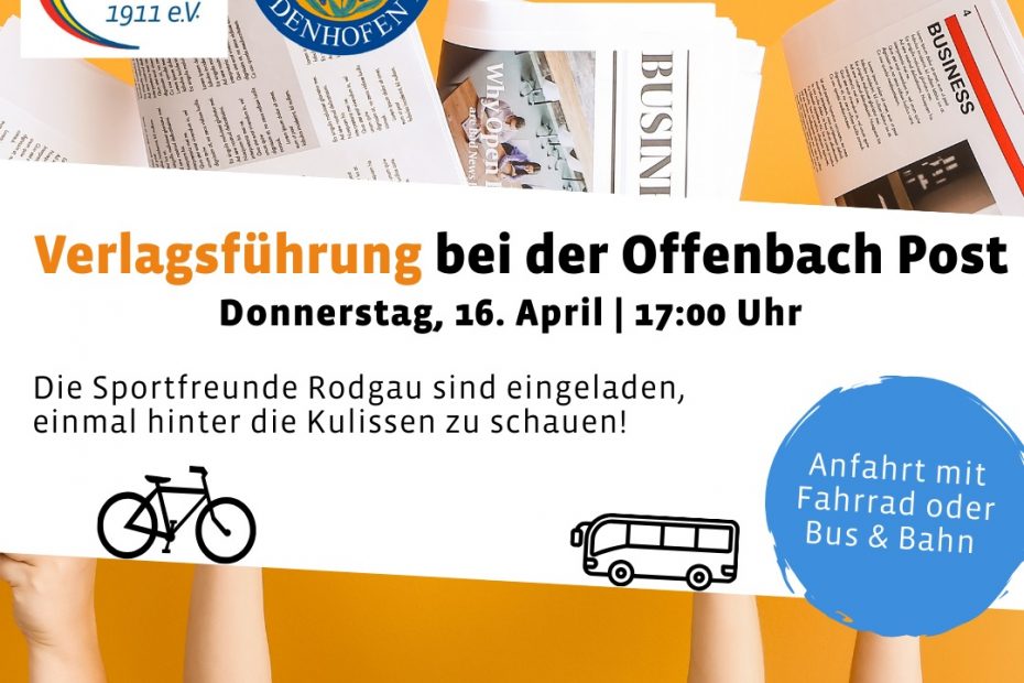 Am Donnerstag, 16. April sind wir zur Verlagsführung bei der Offenbach-Post eingeladen. Beginn dort um 17:00 Uhr. Wir planen mit zwei verschiedenen Gruppen hinzufahren – eine Gruppe mit dem Fahrrad von der EVO-Sportfabrik bis Offenbach und… Weiterlesen »16.04.2026 Verlagsführung Offenbach-Post